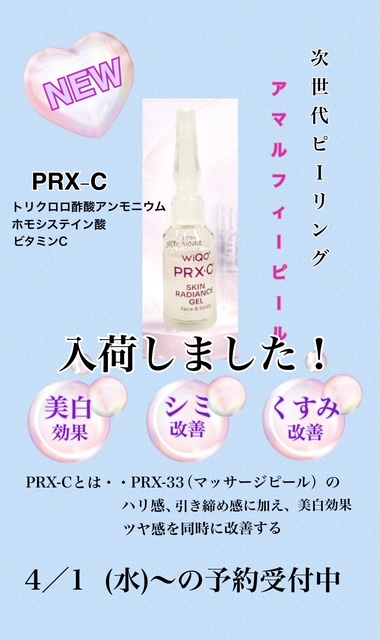 PRX-33 マッサージピールよりPRX-C アマルフィーピールが4月上旬入荷予定です。マッサージピールの引き上げ、ツヤ感に加え、美白効果が